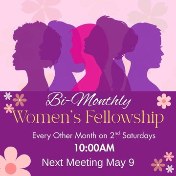 Women's Ministry meets every other month on 2nd Saturdays at 10:00AM. Next Meeting is May 9. All Ladies are welcome to join us!